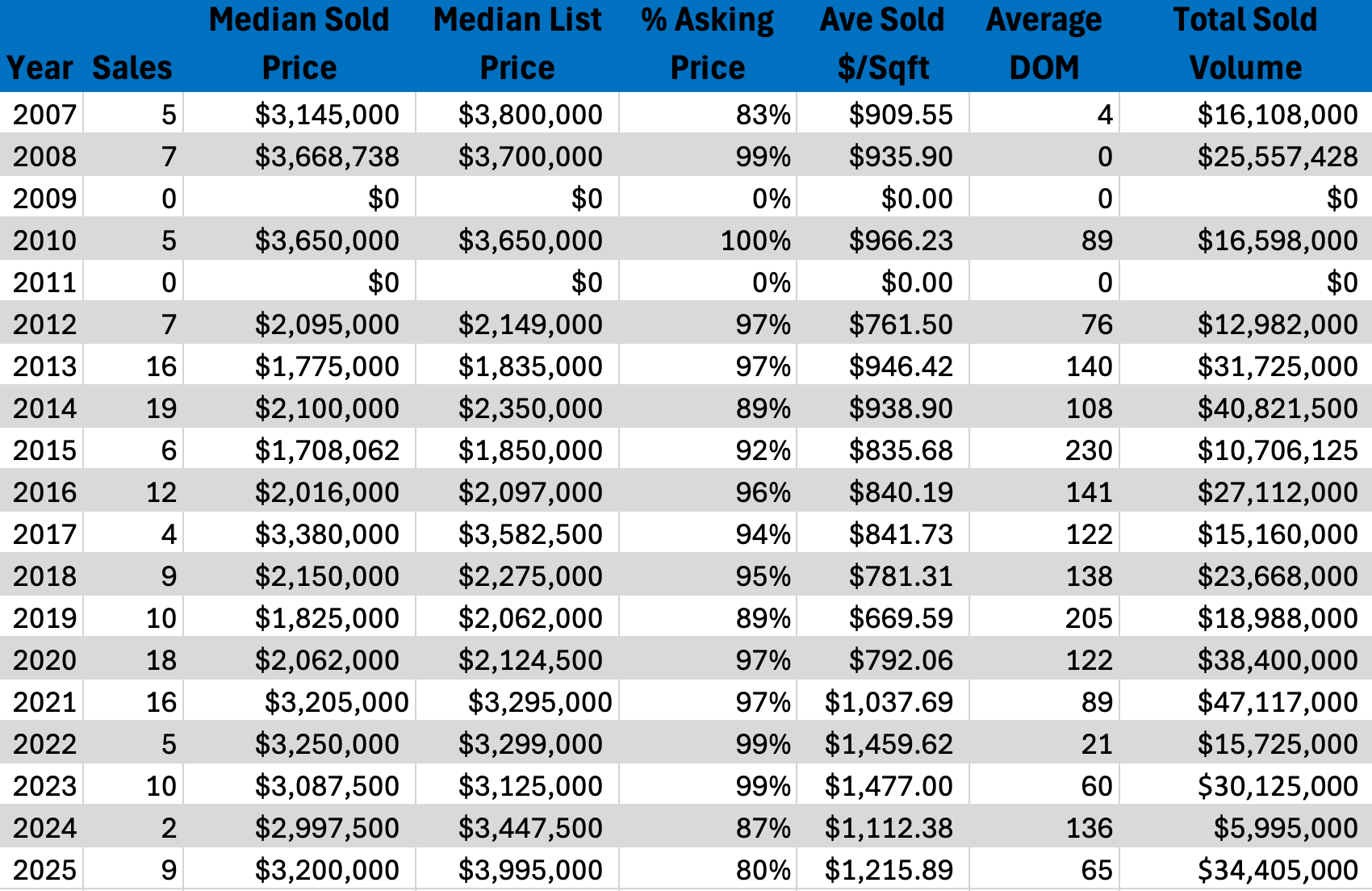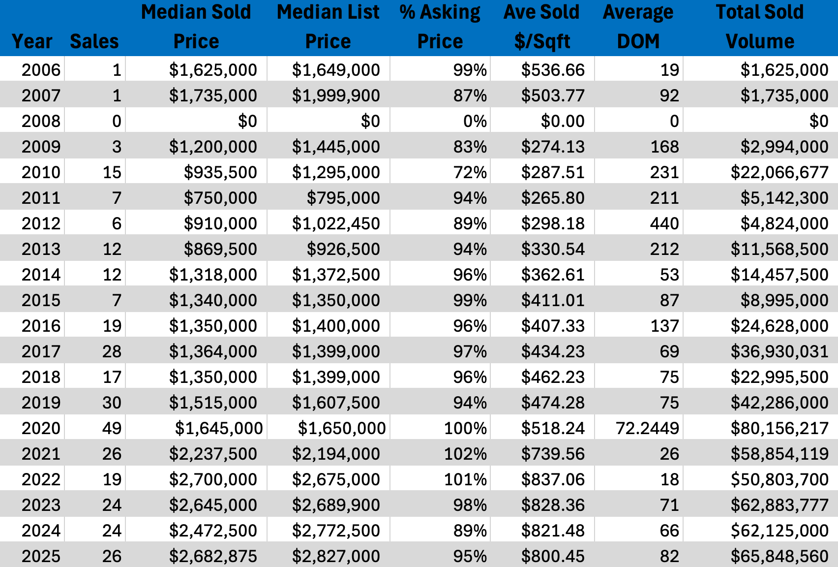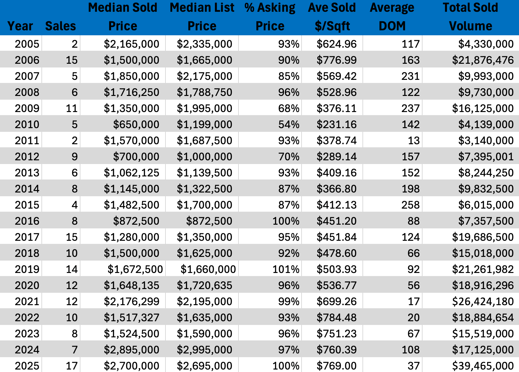 Historically, Mountainside has operated as a boutique luxury market with limited inventory and pronounced price sensitivity. Early years saw exceptionally high pricing relative to the broader market, followed by periods of recalibration. Over time, the community has demonstrated resilience through scarcity and construction quality. The long-term data suggests Mountainside rewards buyers focused on quality and long-term hold value rather than short-term market timing.