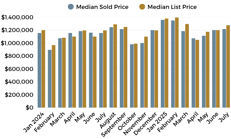 Despite the pullback in volume, prices have proven resilient. The median sold price held steady at $1,210,000, inching just above June’s $1.2M benchmark and marking a 5% increase over July 2024. That kind of price stability, amid slower sales and growing inventory, reflects a market that’s found its footing, even as it cools from past extremes.