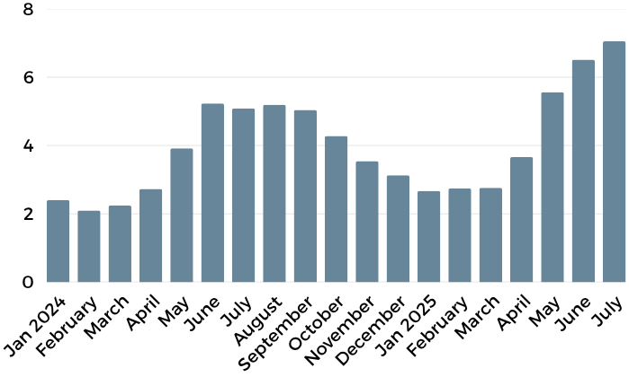 Inventory levels underscore this shift. July saw an 8.3% rise in listings from the previous month, and a staggering 39% increase year-over-year. With 7.05 months of inventory now available, this is the highest supply we’ve seen since well before the pandemic boom. For context, anything above 6 months is considered a buyer’s market, meaning negotiation is not just encouraged, it’s expected.