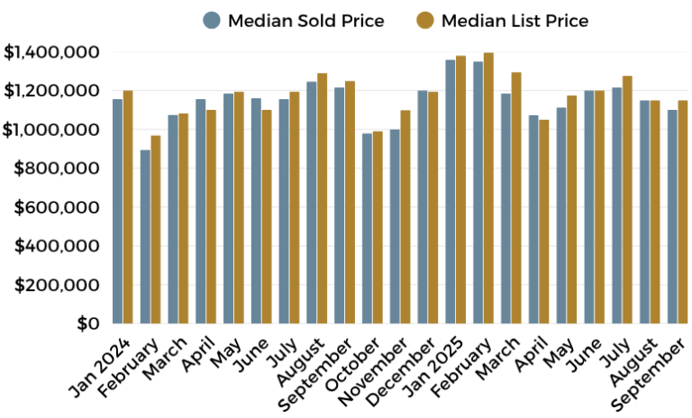 The median sold price fell to $1,100,000, representing a 4.3% month-over-month and 9.4% year-over-year decline. This is the third consecutive month of price softening, reinforcing that today’s buyers are price-sensitive and unwilling to stretch for homes that don’t present clear value.
